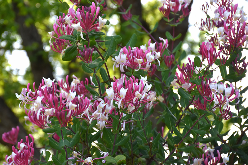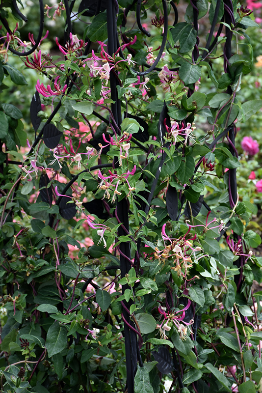 Peaches And Cream Honeysuckle features showy clusters of fragrant shell pink trumpet-shaped flowers with rose overtones at the ends of the branches from late spring to mid summer. It features an abundance of magnificent red berries from mid to late summer. It has green deciduous foliage. The oval leaves do not develop any appreciable fall color.