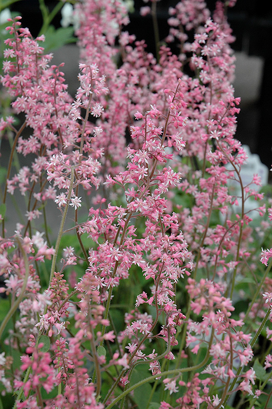 Oakleaf Foamflower has masses of beautiful spikes of lightly-scented shell pink bell-shaped flowers with white overtones rising above the foliage from mid spring to mid summer, which emerge from distinctive pink flower buds, and which are most effective when planted in groupings. The flowers are excellent for cutting. Its attractive lobed leaves emerge chartreuse in spring, turning dark green in color. The foliage often turns coppery-bronze in fall. The dark red stems are very colorful and add to the overall interest of the plant.