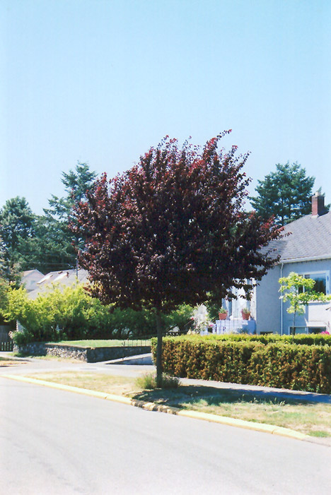 Newport Plum is a deciduous tree with a shapely oval form. Its average texture blends into the landscape, but can be balanced by one or two finer or coarser trees or shrubs for an effective composition.
