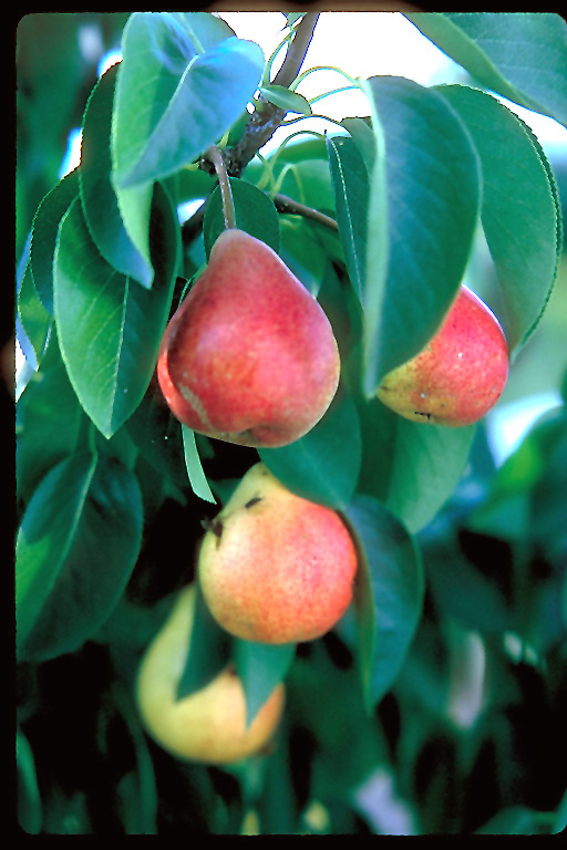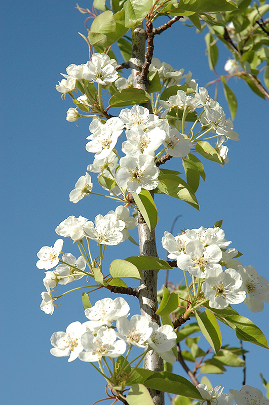One of the hardiest pears with clouds of showy white flowers in spring, good fall color and a consistent oval form; small firm greenish-red fruit, reasonable quality, good flavor; fallen fruit can be messy, but self-pollinating and resistant to fireblight