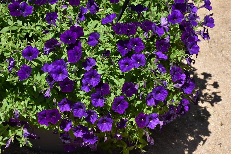 Supertunia® Royal Velvet® Petunia is covered in stunning purple trumpet-shaped flowers at the ends of the stems from mid spring to mid fall. Its pointy leaves remain green in color throughout the season.