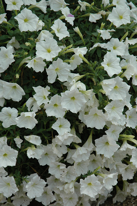 Supertunia® White Petunia is clothed in stunning white trumpet-shaped flowers at the ends of the stems from mid spring to mid fall. Its pointy leaves remain green in color throughout the season.