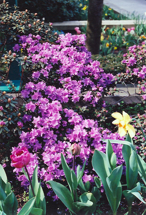 Ramapo Rhododendron is clothed in stunning clusters of violet trumpet-shaped flowers with purple overtones and lavender centers at the ends of the branches in mid spring. It has green evergreen foliage. The narrow leaves turn coppery-bronze in the fall, which persists throughout the winter.