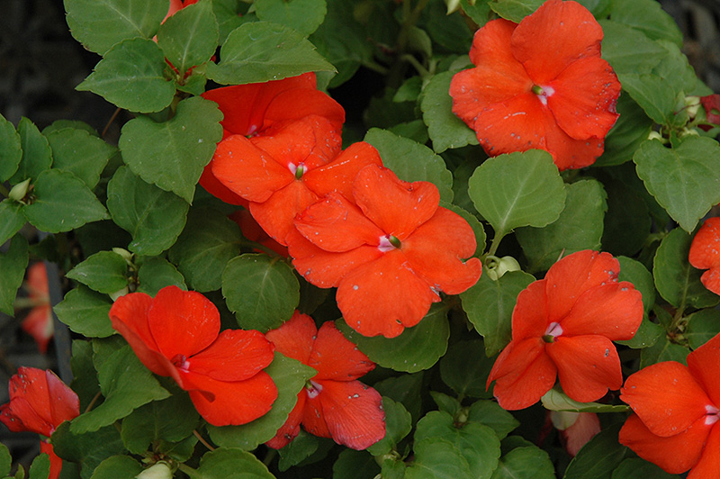 Super Elfin® Bright Orange Impatiens will grow to be about 10 inches tall at maturity, with a spread of 12 inches. When grown in masses or used as a bedding plant, individual plants should be spaced approximately 10 inches apart. Its foliage tends to remain low and dense right to the ground. This fast-growing annual will normally live for one full growing season, needing replacement the following year.