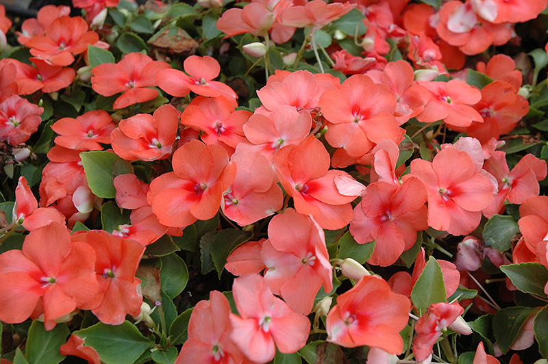 Super Elfin® Apricot Impatiens is blanketed in stunning salmon round flowers at the ends of the stems from mid spring to late summer. Its small pointy leaves remain green in color throughout the season.