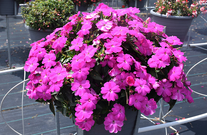 SunPatiens® Compact Lilac New Guinea Impatiens features bold lilac purple round flowers at the ends of the stems from mid spring to early fall. Its pointy leaves remain dark green in color throughout the season.