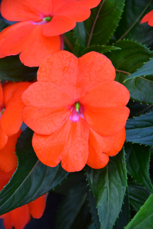 Sonic® Orange New Guinea Impatiens features bold orange round flowers at the ends of the stems from mid spring to early fall. Its pointy leaves remain dark green in color throughout the season.