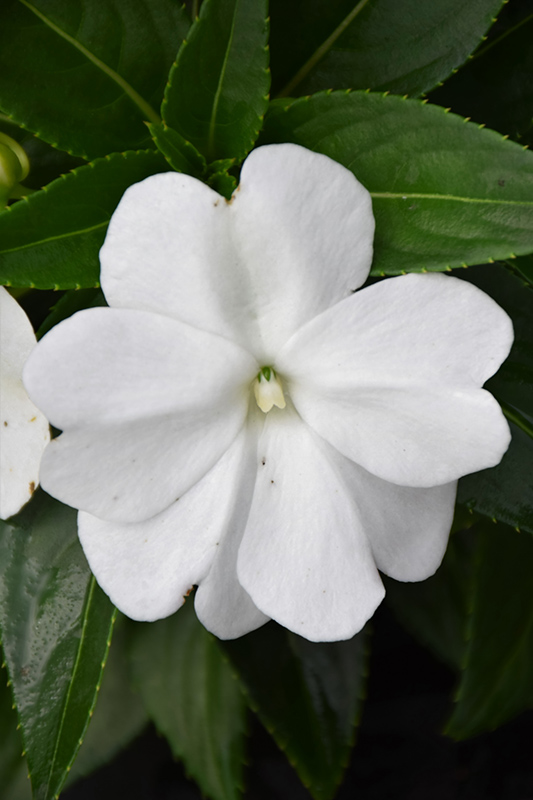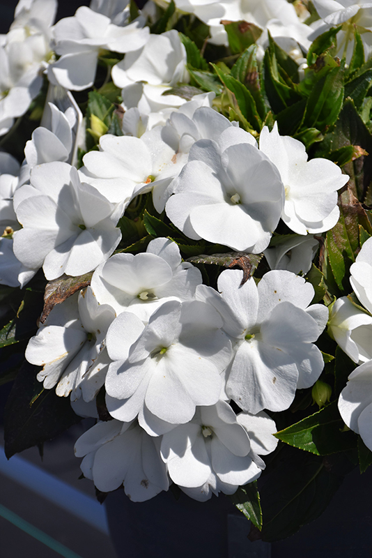 Sonic® White New Guinea Impatiens features bold white round flowers at the ends of the stems from mid spring to early fall. Its pointy leaves remain dark green in color throughout the season.