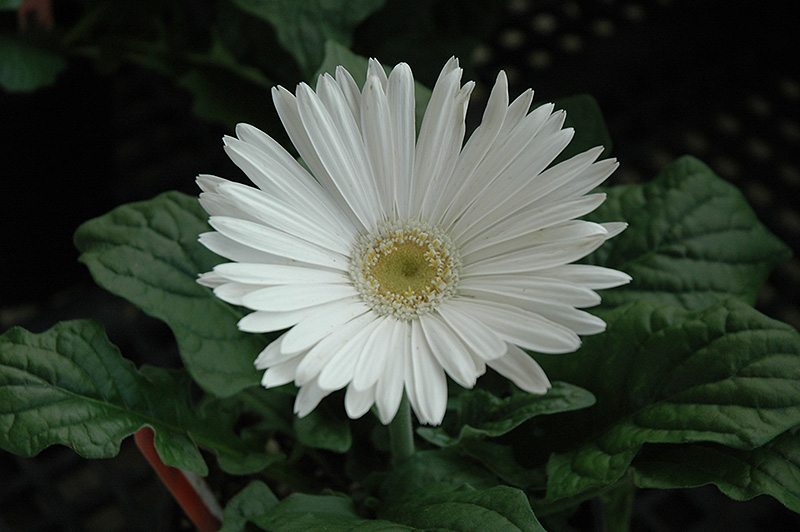 White Gerbera Daisy features bold semi-double white daisy flowers with yellow eyes at the ends of the stems from early summer to mid fall. The flowers are excellent for cutting. Its tomentose oval leaves remain bluish-green in color throughout the season.