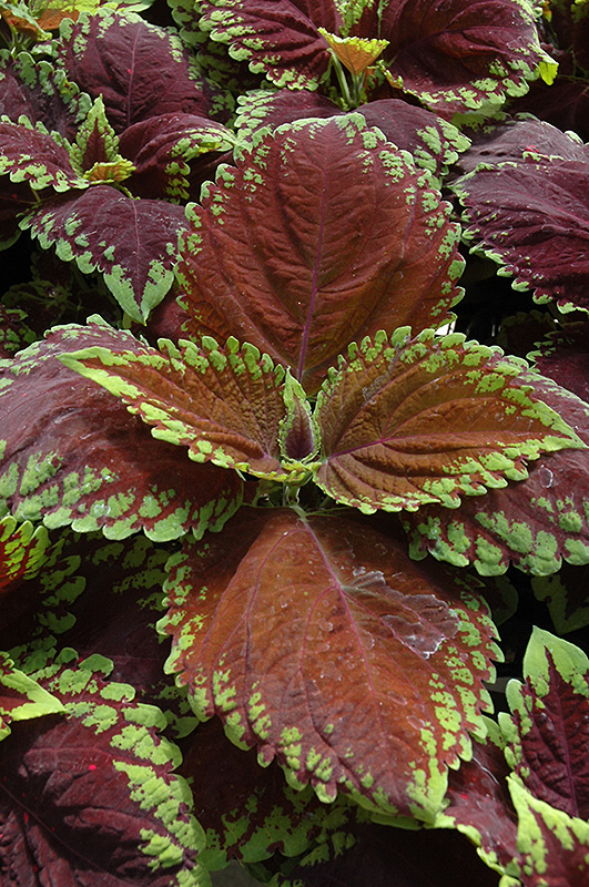 Kong Scarlet Coleus' attractive large serrated pointy leaves remain burgundy in color with distinctive light green edges and tinges of scarlet throughout the year on a plant with an upright spreading habit of growth.