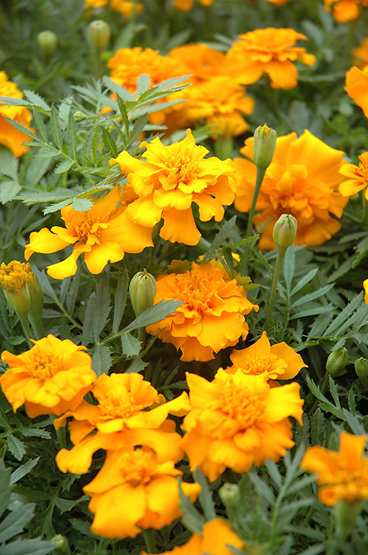 Little Hero Gold Marigold features bold semi-double gold pincushion flowers with orange overtones at the ends of the stems from late spring to late summer. The flowers are excellent for cutting. Its fragrant ferny leaves remain dark green in color throughout the season.