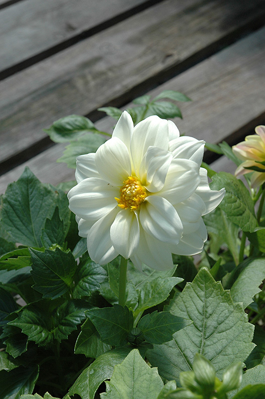 Figaro™ White Dahlia features showy semi-double white daisy flowers with yellow eyes at the ends of the stems from mid to late summer. The flowers are excellent for cutting. Its pointy leaves remain green in color throughout the season.