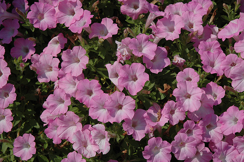 Supertunia® Pink Charm Petunia is bathed in stunning pink trumpet-shaped flowers with shell pink centers at the ends of the stems from mid spring to mid fall. Its pointy leaves remain green in color throughout the season.