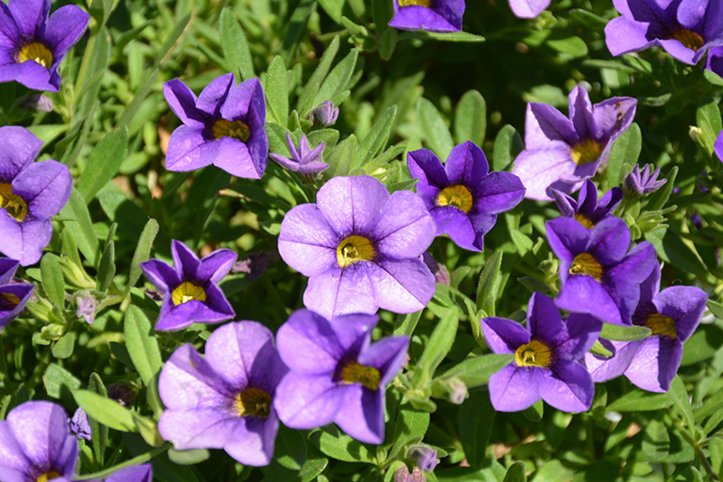 MiniFamous® Compact Blue Calibrachoa is smothered in stunning purple trumpet-shaped flowers at the ends of the stems from late spring to early fall. Its small pointy leaves remain green in color throughout the season.
