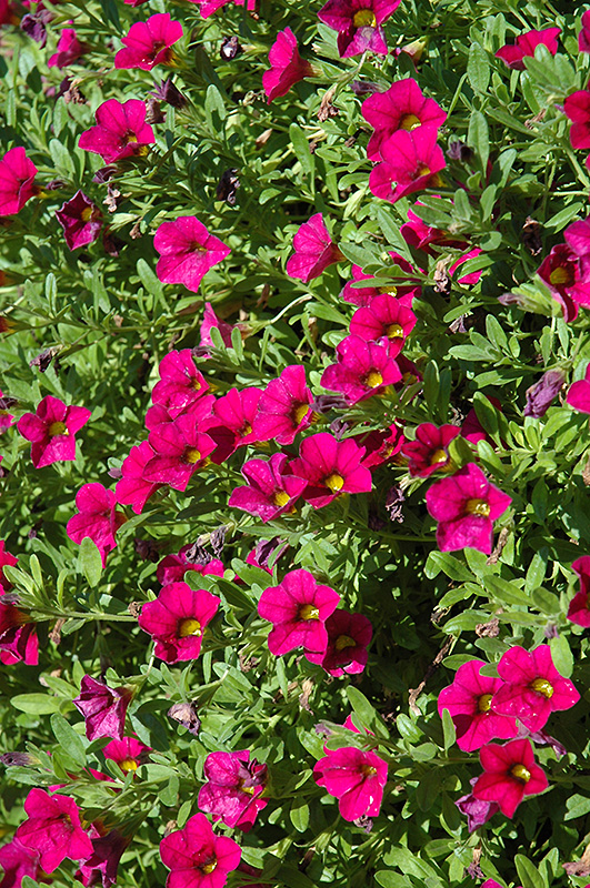 MiniFamous® Compact Purple Calibrachoa is bathed in stunning fuchsia trumpet-shaped flowers at the ends of the stems from late spring to early fall. Its small pointy leaves remain green in color throughout the season.