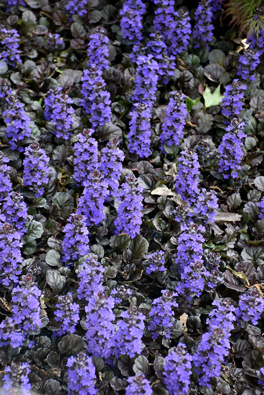Black Scallop Bugleweed's attractive small crinkled round leaves emerge dark green in spring, turning deep purple in color the rest of the year on a plant with a spreading habit of growth. It features subtle spikes of blue flowers rising above the foliage from mid spring to early summer.