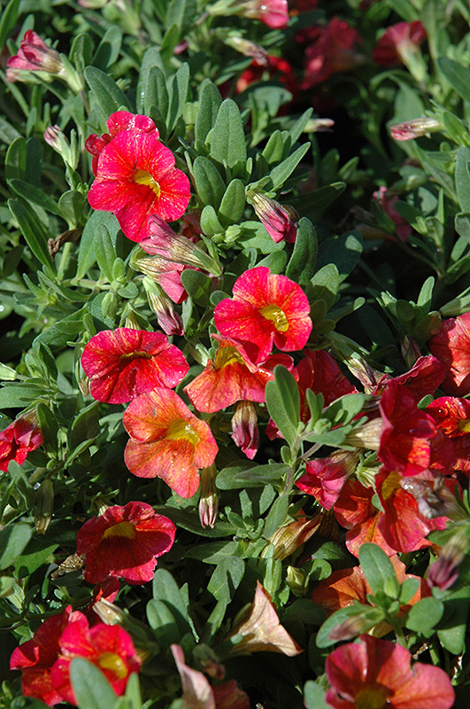 Superbells® Tequila Sunrise Calibrachoa will grow to be about 10 inches tall at maturity, with a spread of 24 inches. When grown in masses or used as a bedding plant, individual plants should be spaced approximately 12 inches apart. Its foliage tends to remain low and dense right to the ground. This fast-growing annual will normally live for one full growing season, needing replacement the following year.
