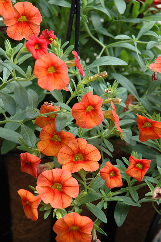 Superbells® Dreamsicle® Calibrachoa is bathed in stunning orange trumpet-shaped flowers with yellow overtones and scarlet stripes at the ends of the stems from late spring to early fall. Its small pointy leaves remain green in color throughout the season.
