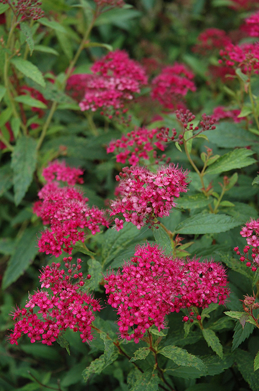 Neon Flash Spirea is covered in stunning clusters of cherry red flowers at the ends of the branches from late spring to early summer. It has attractive forest green deciduous foliage which emerges red in spring. The small serrated pointy leaves are highly ornamental and turn an outstanding coppery-bronze in the fall.