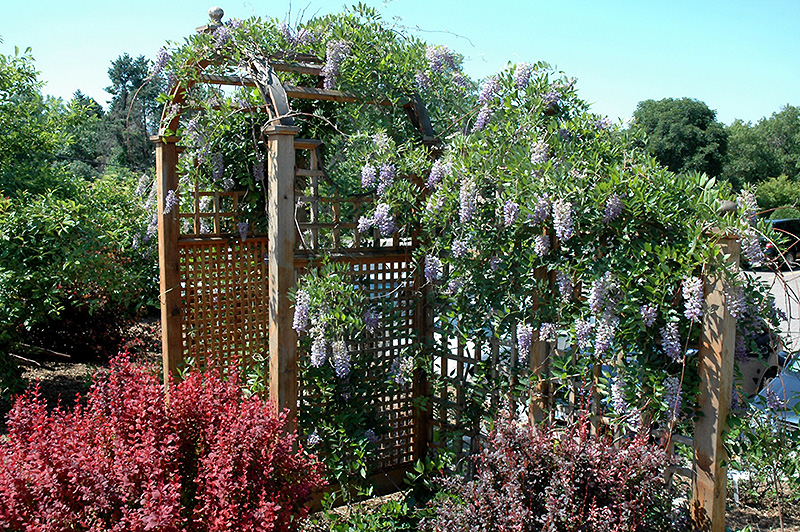 Summer Cascade™ Wisteria will grow to be about 25 feet tall at maturity, with a spread of 24 inches. As a climbing vine, it tends to be leggy near the base and should be underplanted with low-growing facer plants. It should be planted near a fence, trellis or other landscape structure where it can be trained to grow upwards on it, or allowed to trail off a retaining wall or slope. It grows at a fast rate, and under ideal conditions can be expected to live for approximately 30 years.