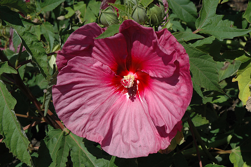 Summerific® Berrylicious Hibiscus features bold lavender round flowers with pink overtones, red eyes and creamy white anthers along the stems from mid summer to early fall. Its large serrated lobed leaves remain green in color throughout the season.