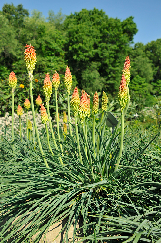Amazing red, orange, and bright yellow flower stalks rise from grassy, evergreen foliage in midsummer, creating a brilliant border or container planting; makes a great cutflower and attracts hummingbirds