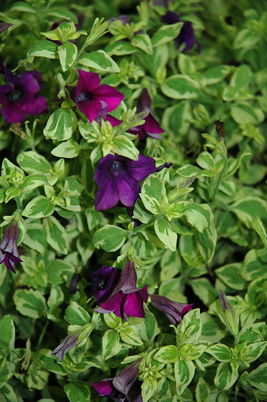Surfinia® Baby Purple Variegata Petunia is blanketed in stunning purple trumpet-shaped flowers at the ends of the stems from mid spring to mid fall. Its pointy leaves remain green in color with showy creamy white variegation throughout the season.