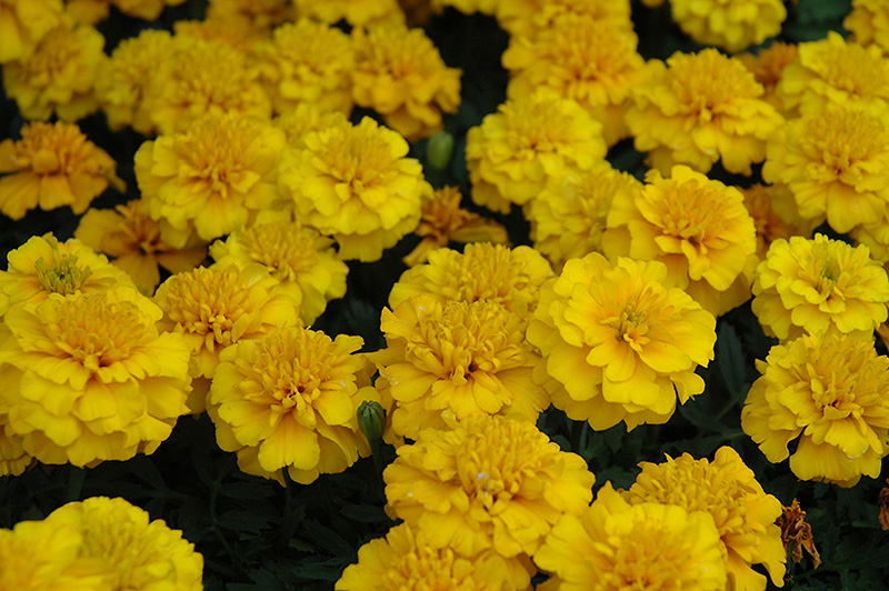 Janie Gold Marigold features bold semi-double gold pincushion flowers at the ends of the stems from late spring to late summer. The flowers are excellent for cutting. Its fragrant ferny leaves remain dark green in color throughout the season.