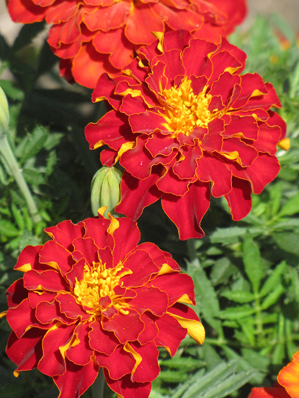 Safari Red Marigold features bold semi-double red pincushion flowers with gold eyes and gold edges at the ends of the stems from late spring to late summer. The flowers are excellent for cutting. Its fragrant ferny leaves remain dark green in color throughout the season.