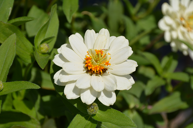 Profusion Double White Zinnia features bold double white ball-shaped flowers with yellow eyes at the ends of the stems from mid spring to late summer. The flowers are excellent for cutting. Its pointy leaves remain green in color throughout the season.