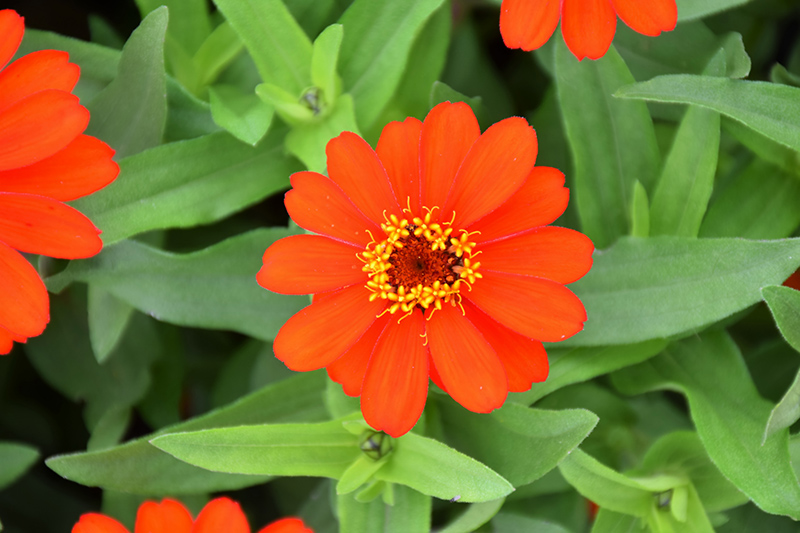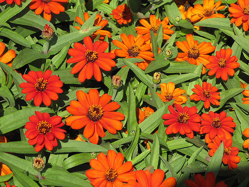 Profusion Fire Zinnia features bold orange daisy flowers with red overtones and yellow eyes at the ends of the stems from mid spring to late summer. The flowers are excellent for cutting. Its pointy leaves remain green in color throughout the season.