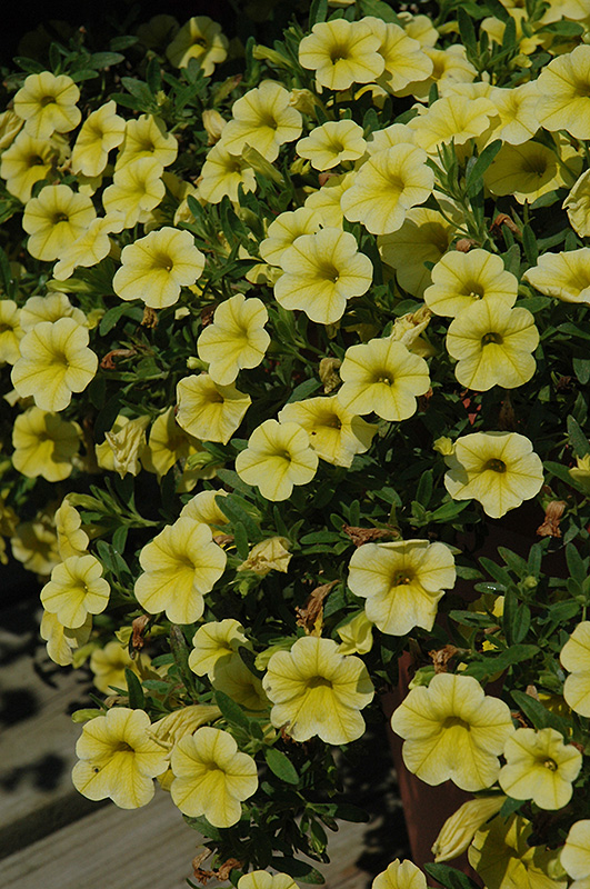 MiniFamous® Compact Safran Calibrachoa is bathed in stunning yellow trumpet-shaped flowers at the ends of the stems from late spring to early fall. Its small pointy leaves remain green in color throughout the season.