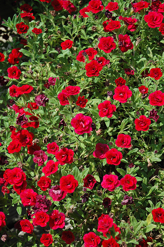 MiniFamous® Double Red Calibrachoa is smothered in stunning double red trumpet-shaped flowers at the ends of the stems from late spring to early fall. Its small pointy leaves remain green in color throughout the season.
