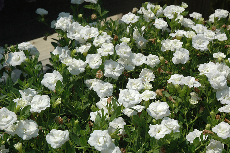 MiniFamous® Double White Calibrachoa is draped in stunning double white trumpet-shaped flowers at the ends of the stems from late spring to early fall. Its small pointy leaves remain green in color throughout the season.
