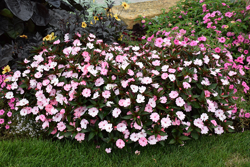 SunPatiens® Compact Blush Pink New Guinea Impatiens is a dense herbaceous annual with a mounded form. Its medium texture blends into the garden, but can always be balanced by a couple of finer or coarser plants for an effective composition.