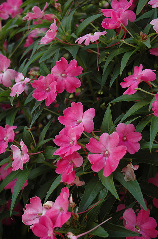 SunPatiens® Vigorous Pink New Guinea Impatiens features bold pink round flowers at the ends of the stems from mid spring to early fall. Its pointy leaves remain dark green in color throughout the season.