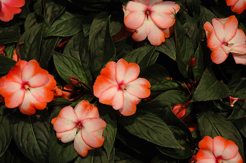 Harmony® Radiance™ Scarlet New Guinea Impatiens features bold white round flowers with scarlet edges at the ends of the stems from mid spring to early fall. Its pointy leaves remain dark green in color throughout the season.