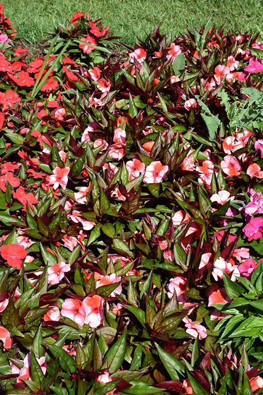 Harmony® Salmon Cream New Guinea Impatiens will grow to be about 12 inches tall at maturity, with a spread of 14 inches. When grown in masses or used as a bedding plant, individual plants should be spaced approximately 14 inches apart. Its foliage tends to remain dense right to the ground, not requiring facer plants in front. This fast-growing annual will normally live for one full growing season, needing replacement the following year.