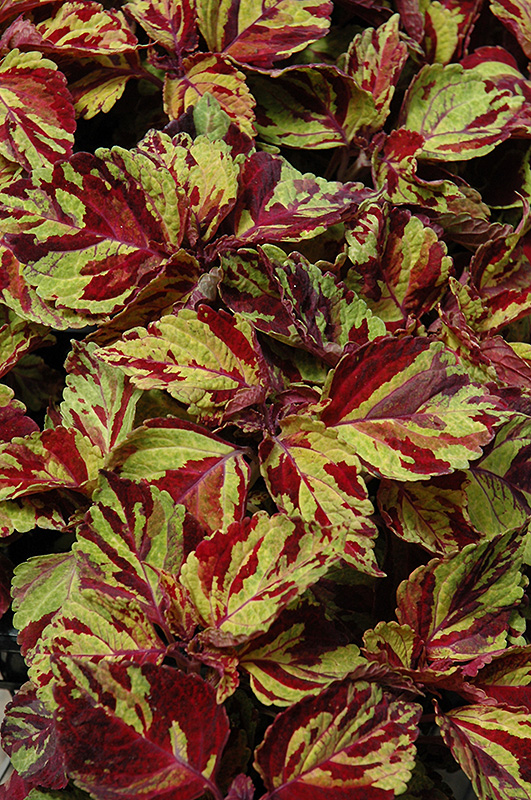 Wizard Mosaic Coleus' attractive serrated pointy leaves remain light green in color with showy ruby-red variegation and tinges of creamy white throughout the year on a plant with an upright spreading habit of growth.