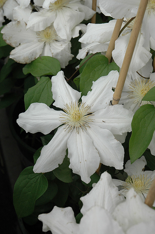 Huge, snow-white flowers with delicate butter stamens are spectacular and early; flowers are produced on a vigorous vine; a great plant for the novice and expert gardener alike