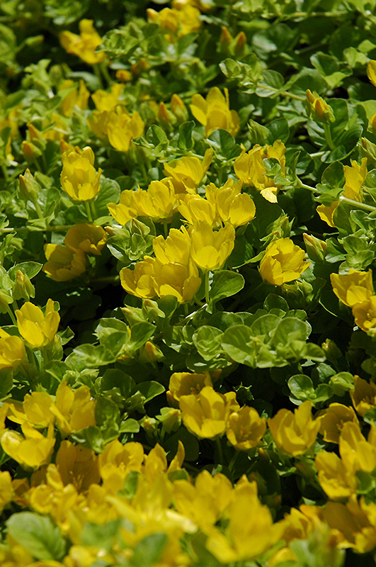 A vigorous and pervasive groundcover, yet not overly aggressive, featuring very showy yellow flowers all summer long held over a low carpet of uniquely paired leaves; almost indestructible, a great groundcover for sun or shade