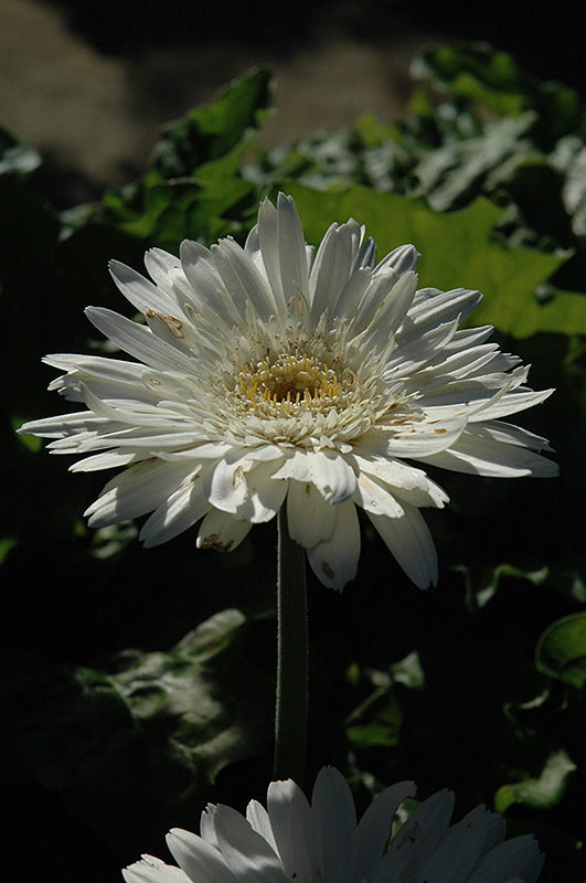 Funtastic White Gerbera Daisy features bold double white daisy flowers with buttery yellow eyes at the ends of the stems from early summer to mid fall. The flowers are excellent for cutting. Its tomentose narrow leaves remain bluish-green in color throughout the season.