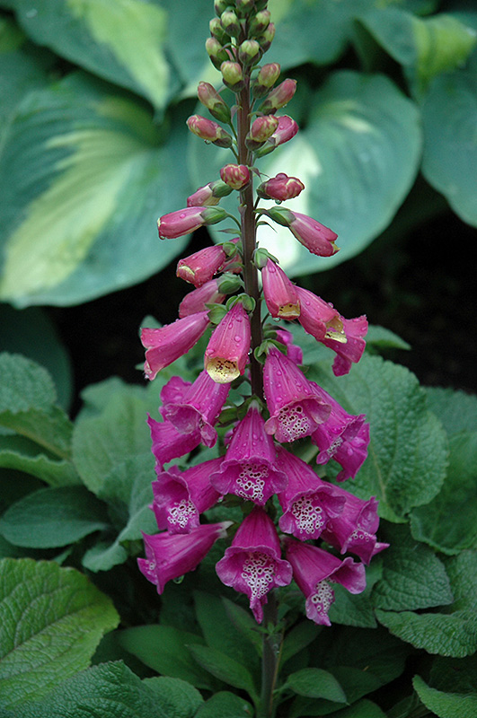 Candy Mountain Foxglove features bold spikes of violet tubular flowers with white overtones and deep purple spots rising above the foliage from late spring to mid summer, which emerge from distinctive rose flower buds. The flowers are excellent for cutting. Its oval leaves remain green in color throughout the season.