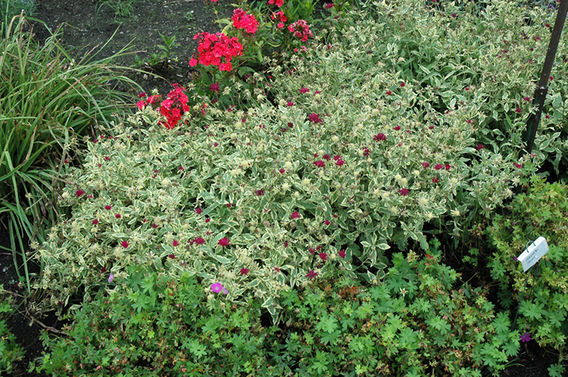 This beautiful variety produces stunning gray-green foliage with cream edges; contrasting reddish-purple flowers open in succession over several months; deadhead to promote new blooms; terrific in containers or for edging sunny borders