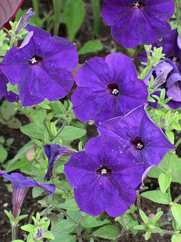 Madness Midnight Petunia is bathed in stunning royal blue trumpet-shaped flowers with deep purple centers at the ends of the stems from mid spring to late summer. Its pointy leaves remain green in color throughout the season.