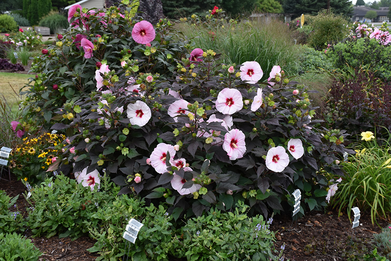 Summerific® Perfect Storm Hibiscus features bold pink round flowers with white overtones and red eyes at the ends of the stems from mid summer to early fall. Its attractive large glossy oval leaves remain black in color throughout the season.