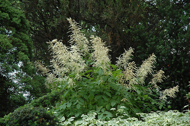 Goatsbeard features showy spikes of creamy white flowers at the ends of the stems from late spring to mid summer. The flowers are excellent for cutting. Its pointy compound leaves remain emerald green in color throughout the season.