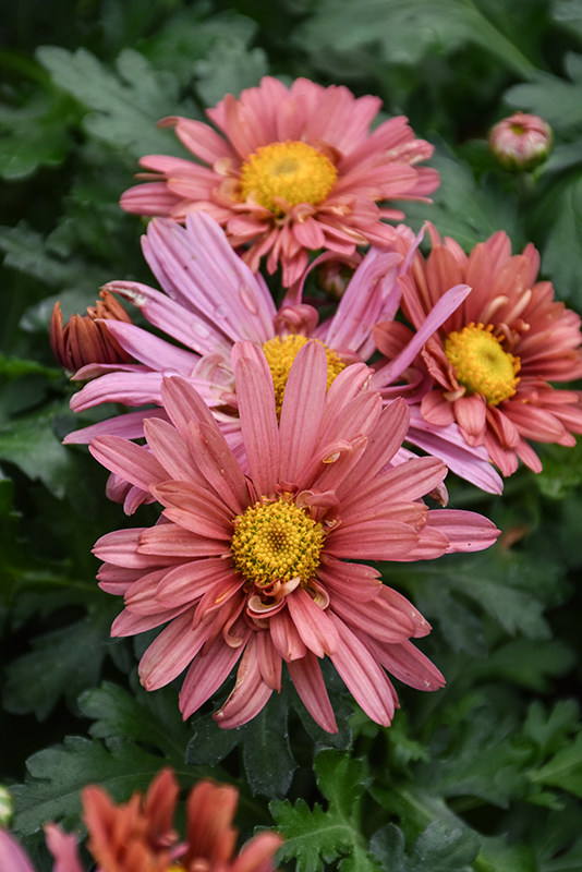 Coral Daisy Chrysanthemum is smothered in stunning coral-pink daisy flowers with yellow eyes at the ends of the stems from early to late fall. The flowers are excellent for cutting. Its fragrant ferny leaves remain green in color throughout the season.