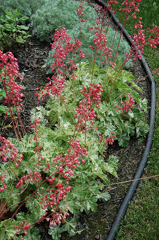 Snow Angel Coral Bells will grow to be about 8 inches tall at maturity extending to 18 inches tall with the flowers, with a spread of 12 inches. When grown in masses or used as a bedding plant, individual plants should be spaced approximately 10 inches apart. Its foliage tends to remain low and dense right to the ground. It grows at a medium rate, and under ideal conditions can be expected to live for approximately 10 years. As an evegreen perennial, this plant will typically keep its form and foliage year-round.