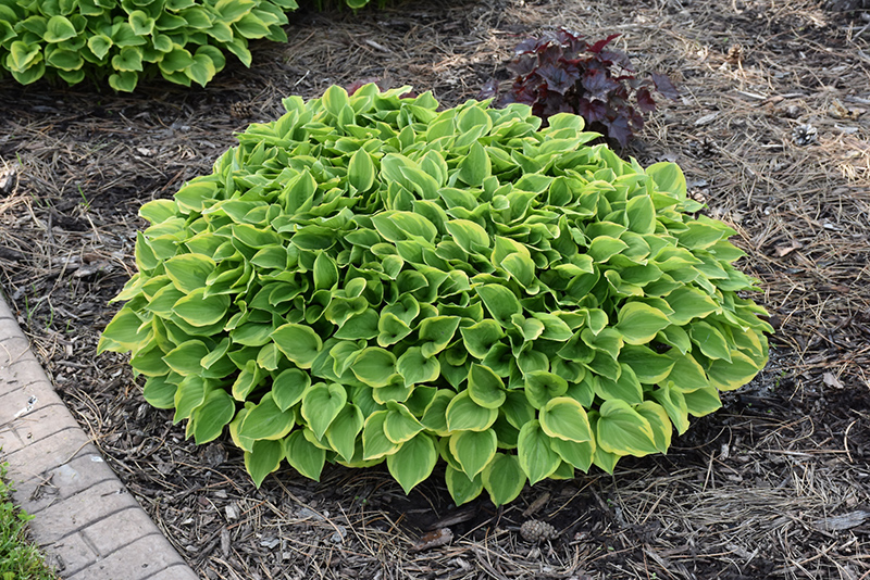 A small to medium variety producing compact mounds of oval, medium green foliage edged in chartreuse; margins mature from chartreuse to golden yellow; purple flowers appear on tall scapes during the summer months; adds color, contrast and texture